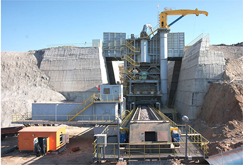 半移動旋回式破碎站為半連續(xù)開采工藝(單斗挖掘機—汽車—破碎站—帶式輸送機系統(tǒng))中的關(guān)鍵設(shè)備,用于大型露天金屬礦山礦石或巖石的初級破碎,將爆破或挖掘后的大塊物料通過破碎機破碎成滿足膠帶機運輸?shù)牧6取?/p>